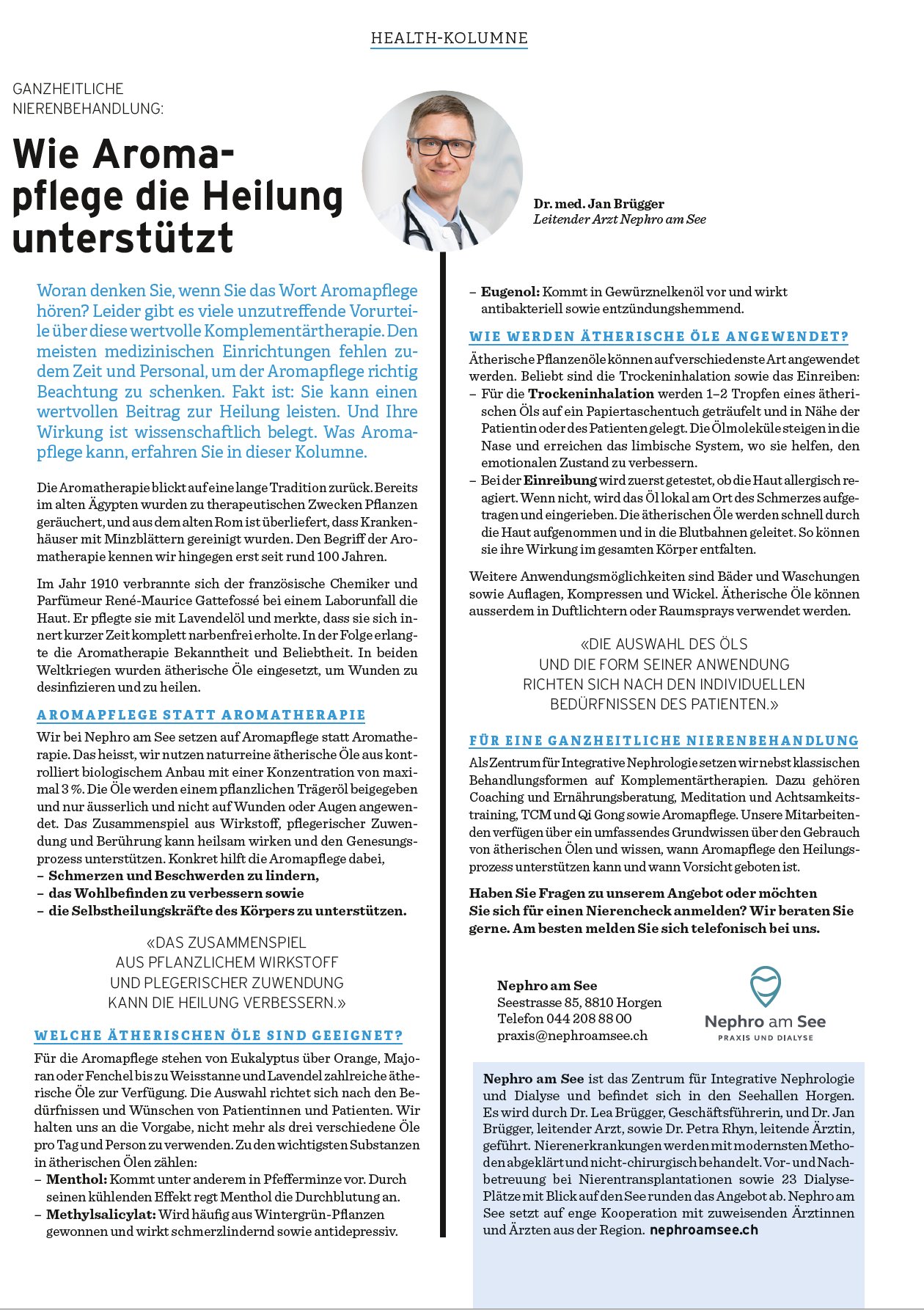 Als Zentrum für Integrative Nephrologie setzen wir nebst klassischen Behandlungsformen auf Komplementärtherapien. Dazu gehören Coaching und Ernährungsberatung, Meditation und Achtsamkeitstraining, TCM und Qi Gong sowie Aromapflege. Unsere Mitarbeitenden verfügen über ein umfassendes Grundwissen über den Gebrauch von ätherischen Ölen und wissen, wann Aromapflege den Heilungsprozess unterstützen kann und wann Vorsicht geboten ist.